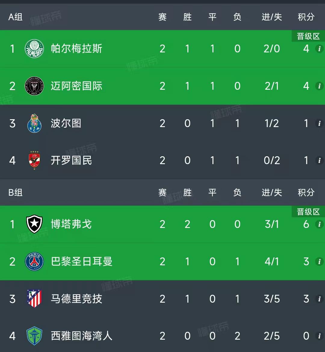 北京时间6月20日亿润配资,世俱杯第二轮A组和B组的比赛结束,我们一起看看最新积分榜变动:帕尔梅拉斯2-0开罗国民,迈阿密国际2-1波尔图;巴黎0-1博塔弗戈、马竞3-1西雅图海湾人!